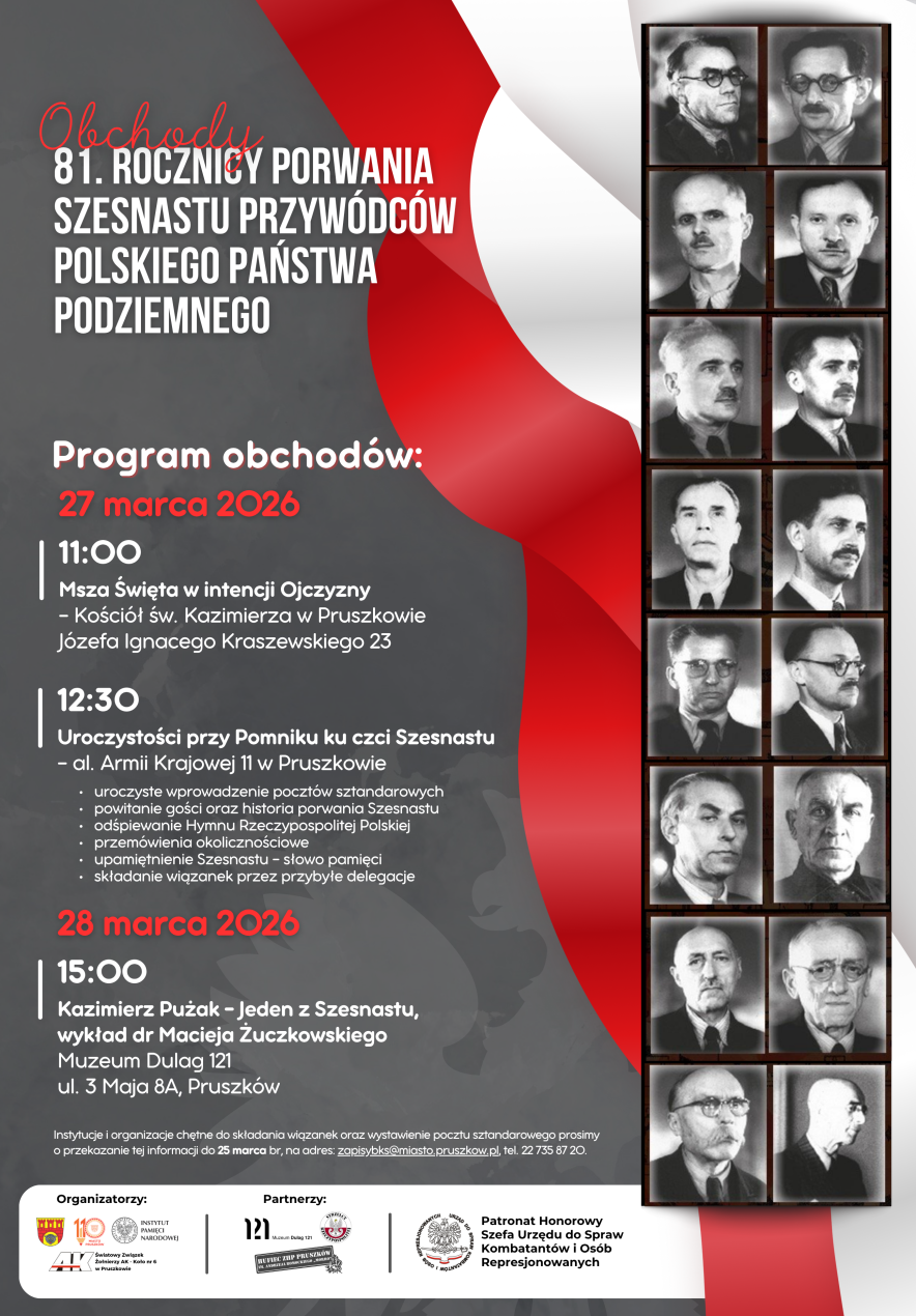 Mieszkańcy Pruszkowa będą mieli okazję wspólnie uczcić pamięć bohaterów porwania Szesnastu, jednego z najbardziej dramatycznych wydarzeń końcowego okresu II wojny światowej. W marcu 1945 roku przywódcy Polskiego Państwa Podziemnego zostali podstępnie aresztowani przez NKWD, co do dziś pozostaje symbolem represji wobec polskich elit niepodległościowych.