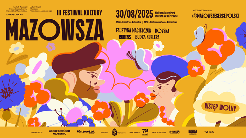 Odkryj piękno Mazowsza w samym sercu Warszawy! Już w sobotę, 30 sierpnia na terenie Multimedialnego Parku Fontann na Podzamczu odbędzie się III Festiwal Kultury Mazowsza organizowany przez samorząd województwa, partnerem wydarzenia jest m.st. Warszawa. W programie spektakle, liczne warsztaty i koncert gwiazd. Na scenie wystąpią Budka Suflera, Bovska, Rubens i Faustyna Maciejczuk.