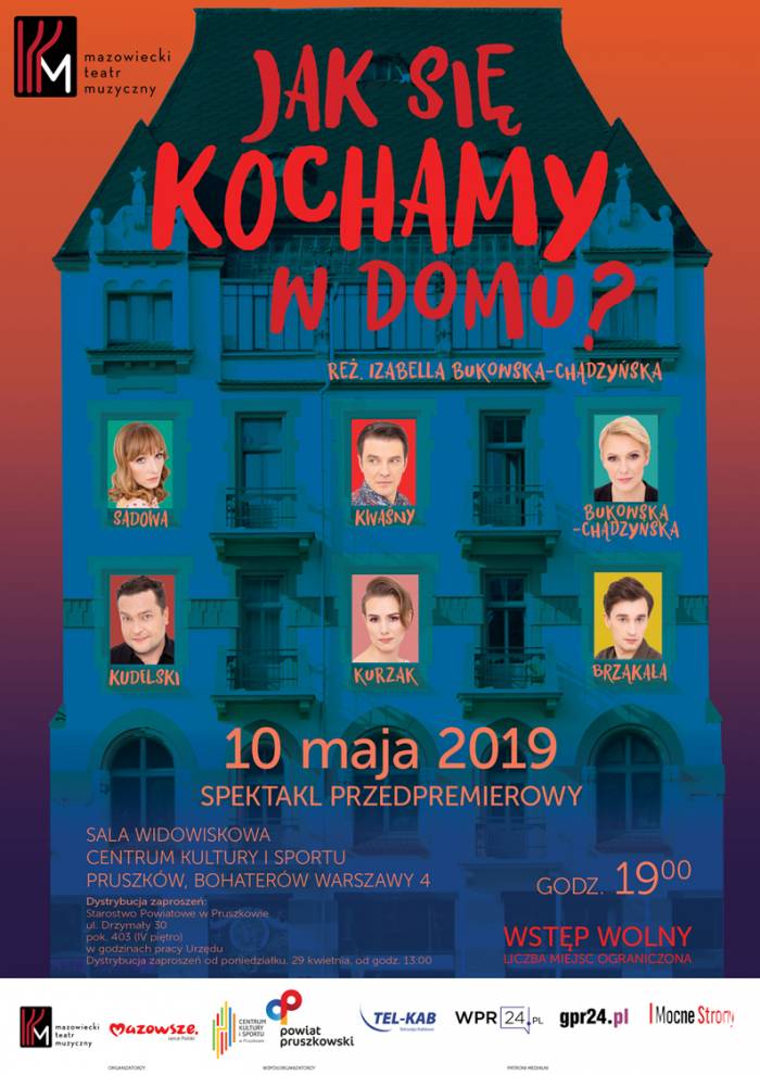 Krzysztof Rymuza Starosta Pruszkowski, Mazowiecki Teatr Muzyczny im. Jana Kiepury w Warszawie oraz Centrum Kultury i Sportu w Pruszkowie zapraszają Mieszkańców Powiatu Pruszkowskiego na przedpremierowy pokaz przedstawienia „Jak się kochamy w domu?” w reżyserii Izabelli Bukowskiej-Chądzyńskiej. Ten wyjątkowy spektakl muzyczny odbędzie się w piątek, 10 maja o godz. 19:00 w sali widowiskowej Centrum Kultury i Sportu w Pruszkowie przy ul. Bohaterów Warszawy 4.