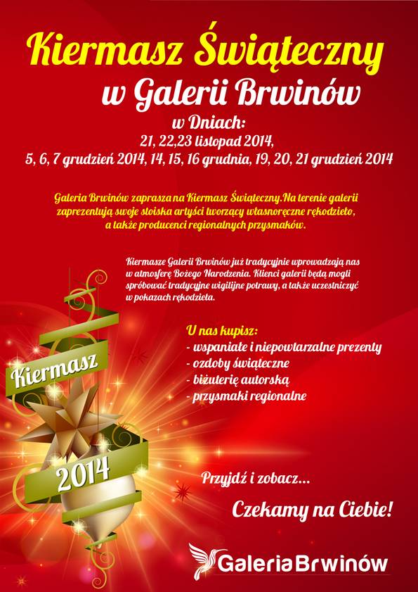 W wybrane weekendyw Galerii Brwinów przy ul. Grodziskiej 46 będą miały miejsce kiermasze rękodzielnicze oraz kiermasze wyrobów świątecznych. Na terenie Galerii zaprezentują swoje stoiska artyści tworzący rękodzieła. W tych dniach odwiedzający galerią będą mieli możliwość zakupu wyjątkowych, ręcznie robionych ozdób świątecznych a także niepowtarzalnych świątecznych prezentów. Również 6 grudnia w Galerii Brwinów będzie można poczuć świąteczna aurę mikołajkową. Dla najmłodszych przygotowano wiele atrakcji m.in. wizytę Mikołaja i konkursy z nagrodami.