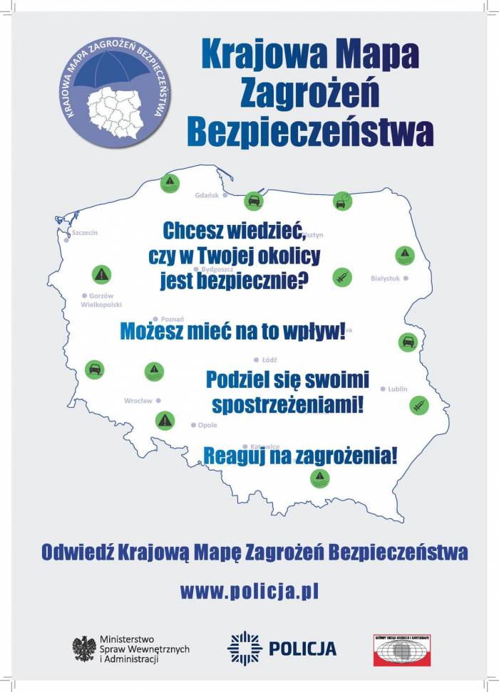Przypominamy, że Krajowa Mapa Zagrożeń Bezpieczeństwa nie służy do zgłaszania pilnej interwencji Policji. W tego typu przypadkach należy korzystać z numeru alarmowego 112. Prosimy o odpowiedzialne korzystanie z aplikacji. Każde naniesione na mapę zagrożenie wywoła odpowiednią reakcję Policji.