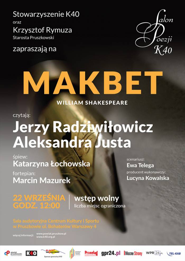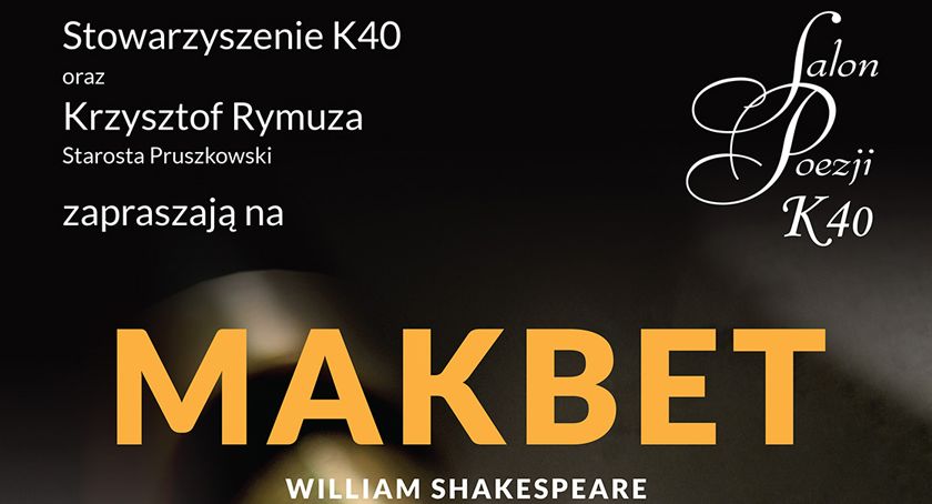 Krzysztof Rymuza Starosta Pruszkowski oraz Ewa Telega Prezes Stowarzyszenia K40 zapraszają na pruszkowski Salon Poezji K40”, podczas którego zaprezentowane zostanie wyjątkowe dzieło Williama Shakespear’a: „Makbet”. W rolę Króla wcieli się jeden z najwybitniejszych polskich aktorów Jerzy Radziwiłowicz. Natomiast jako Lady Makbet wystąpi Aleksandra Justa - aktorka Teatru Narodowego. Muzyczną oprawę przygotują Katarzyna Łochowska - śpiew i Marcin Mazurek - fortepian. To niezwykłe spotkanie z poezją odbędzie się 22 września o godz. 12:00 w sali audytoryjnej Centrum Kultury i Sportu w Pruszkowie, przy ul. Bohaterów Warszawy 4. Wstęp wolny. Liczba miejsc ograniczona.