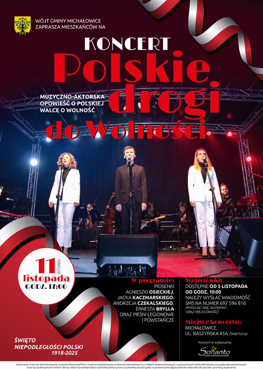 Tego samego dnia, o godz. 17:00, zapraszamy do świetlicy w Michałowicach przy ul. Raszyńskiej 45A na koncert „Polskie drogi do wolności” – muzyczno-aktorską opowieść o polskiej walce o niepodległość w wykonaniu zespołu Sonanto.