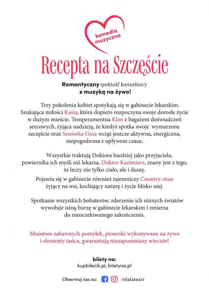 11 GRUDNIA o godz. 19:00 gramy spektakl komediowy "Recepta na szczęście" w MIEJSKIM OŚRODKU KULTURY W PIASTOWIE.