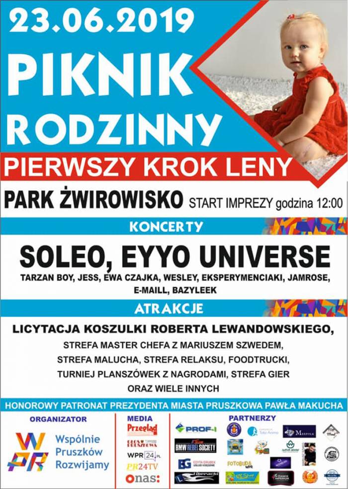 23 czerwca o godzinie 12:00 w pruszkowskim parku Żwirowisko odbędzie się Piknik Rodzinny - Pierwszy krok Leny. Honorowy Patronat nad imprezą objął prezydent Pruszkowa Paweł Makuch.
