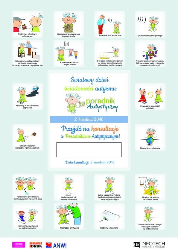 Zapraszamy na http://poradnikautystyczny, gdzie od 15 marca 2015r. na stronie http://www.poradnikautystyczny.pl/post/swiatowy-dzien-swiadomosci-autyzmu-2016/lista_placowek znajdą Państwo listę gabinetów biorących udział w akcji ogólnopolskich bezpłatnych konsultacji z okazji tegorocznego Światowego Dnia Świadomości Autyzmu. Akcji patronuje Rzecznik Praw Dziecka Pan Marek Michalak.