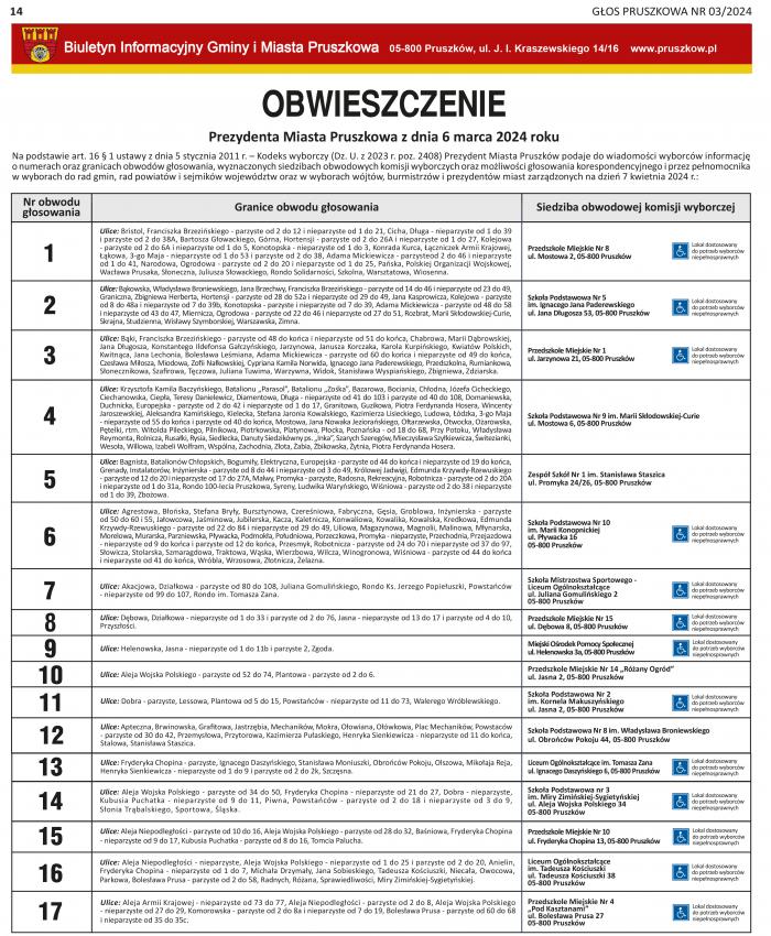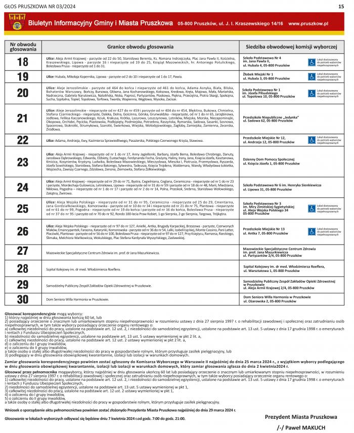 Na podstawie art. 16 § 1 ustawy z dnia 5 stycznia 2011 r. – Kodeks wyborczy (Dz. U. z 2023 r. poz. 2408) Prezydent Miasta Pruszków podaje do wiadomości wyborców informację o numerach oraz granicach obwodów głosowania, wyznaczonych siedzibach obwodowych komisji wyborczych oraz możliwości głosowania korespondencyjnego i przez pełnomocnika w wyborach do rad gmin, rad powiatów i sejmików województw oraz w wyborach wójtów, burmistrzów i prezydentów miast zarządzonych na dzień 7 kwietnia 2024 r.: