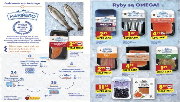 Biedronka systematycznie rozszerza swoją ofertę ryb i wraz z Instytutem Żywności i Żywienia aktywnie promuje ich konsumpcję w ramach kampanii „Ryby są o!mega w Biedronce”. Obecnie w ofercie świeżych ryb zawierających kwasy Omega 3 są obok pstrąga tęczowego takie ryby jak: łosoś norweski świeży filet, tołpyga filet oraz śledź tusza.