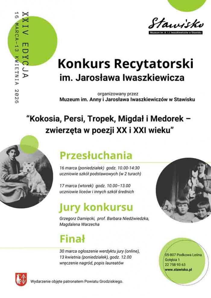 09 lutego- poniedziałek. Ostatni moment na zgłoszenie się na warsztaty aktorskie z Magdaleną Warzechą, aktorką Teatru Narodowego. Warsztaty są elementem przygotowań do tegorocznej edycji Konkursu recytatorskiego im. J. Iwaszkiewicza. Dwudziesta czwarta już edycja zatytułowana: Kokosia, Persi, Tropek, Migdał i Medorek – zwierzęta w poezji XX i XXI wieku ma przypomnieć o niezwykłym przywiązaniu gospodarzy Stawiska do zwierząt. Poetycka rywalizacja będzie okazją do przypomnienia najpiękniejszych wierszy podejmujących temat zwierzęcego świata. W poszukiwaniu odpowiednich utworów zachęcamy do skorzystania z antologii poezji Opowiedz zwierzę. Poetki i poeci o zwierzętach. Autorką wyboru ponad dwustu wierszy wybitnych polskich poetów jest Barbara Niedźwiedzka (Wydawnictwo UNIVERSITAS, partner konkursu). Warsztaty recytatorskie odbędą się 23 lutego, liczba miejsc ograniczona. Więcej informacji o wymogach konkursowych, karty zgłoszeń (na warsztaty recytatorskie, jak i do konkursowych zmagań) oraz regulamin dostępne są w zakładce KONKURSY na stronie www.stawisko.pl