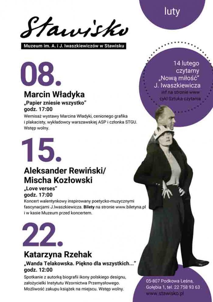 22 lutego – niedziela, godz. 12:00. Spotkanie autorskie z Katarzyną Rzehak autorką biografii Wandy Telakowskiej „Piękno dla wszystkich, czyli jak powstało polskie wzornictwo powojenne”: ikony polskiego designu, założycielki Instytutu Wzornictwa Przemysłowego. Możliwość zakupu książek na miejscu. Rozmowę poprowadzi Beata Izdebska-Zybała. Wstęp wolny.