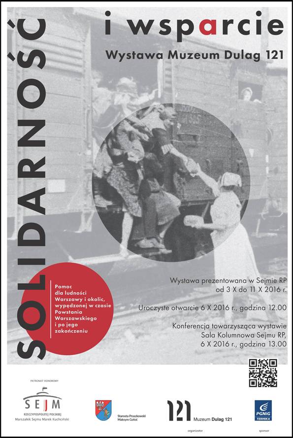 miło nam poinformować, że w związku z obchodzonym 2 października Dniem Pamięci o Cywilnej Ludności Powstańczej Warszawy 6 października w Hallu Głównym Sejmu RP (na I piętrze), a w dn. 29 października w Domu Spotkań z Historią przy ul. Karowej 20 odbędzie się prezentacja przygotowanej przez Muzeum Dulag 121 wystawy „Solidarność i Wsparcie”, nad którą patronat objął Marszałek Sejmu Rzeczypospolitej Polskiej Marek Kuchciński. Przedstawia ona historię przymusowego wysiedlenia ludności cywilnej Warszawy podczas Powstania Warszawskiego i tuż po jego zakończeniu, kładąc akcent na temat pomocy niesionej wypędzonym w obozie Dulag 121 w Pruszkowie, okolicznych miejscowościach oraz na terenie Generalnego Gubernatorstwa.