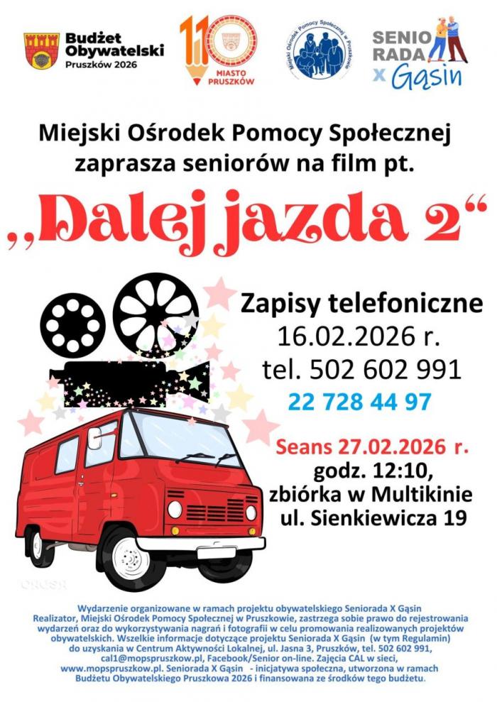 Miejski Ośrodek Pomocy Społecznej zaprasza seniorów na film Zapisy telefoniczne od 16.02.2026 r, Tel,: +48 502 602 991 22 728 44 97 Seans odbędzie się 27.02.2026 r. Godzina 12:10 Zbiórka w Multikinie przy ul. Sienkiewicza 19 w Pruszkowie