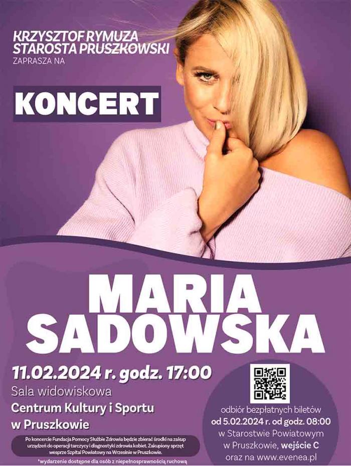 Krzysztof Rymuza Starosta Pruszkowski zaprasza wszystkich Mieszkańców na fantastyczny, karnawałowy koncert Marii Sadowskiej, który odbędzie się 11 lutego o godz. 17:00 w Centrum Kultury i Sportu w Pruszkowie.