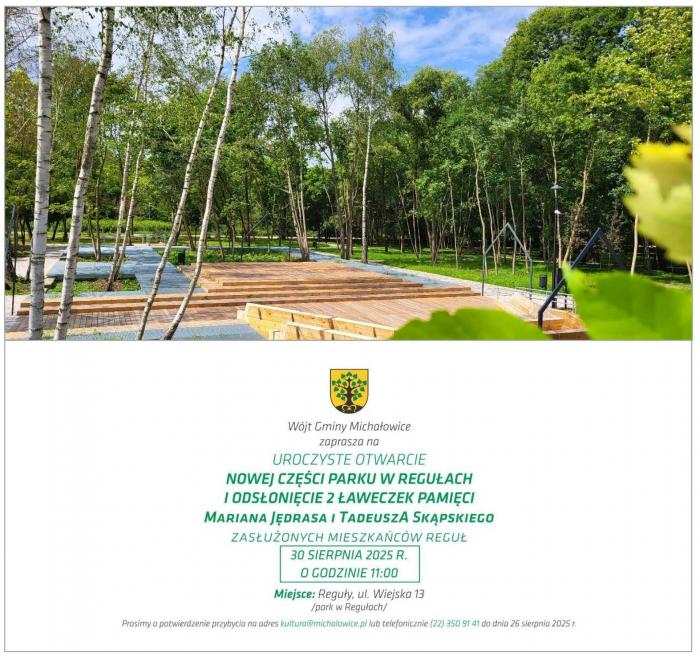 w imieniu Wójt Gminy Michałowice, Małgorzaty Pacheckiej, mamy zaszczyt i przyjemność serdecznie zaprosić na uroczyste otwarcie nowej części Parku w Regułach oraz odsłonięcie ławeczek zasłużonych mieszkańców Reguł – Panów Mariana Jędrasa i Tadeusza Skąpskiego.